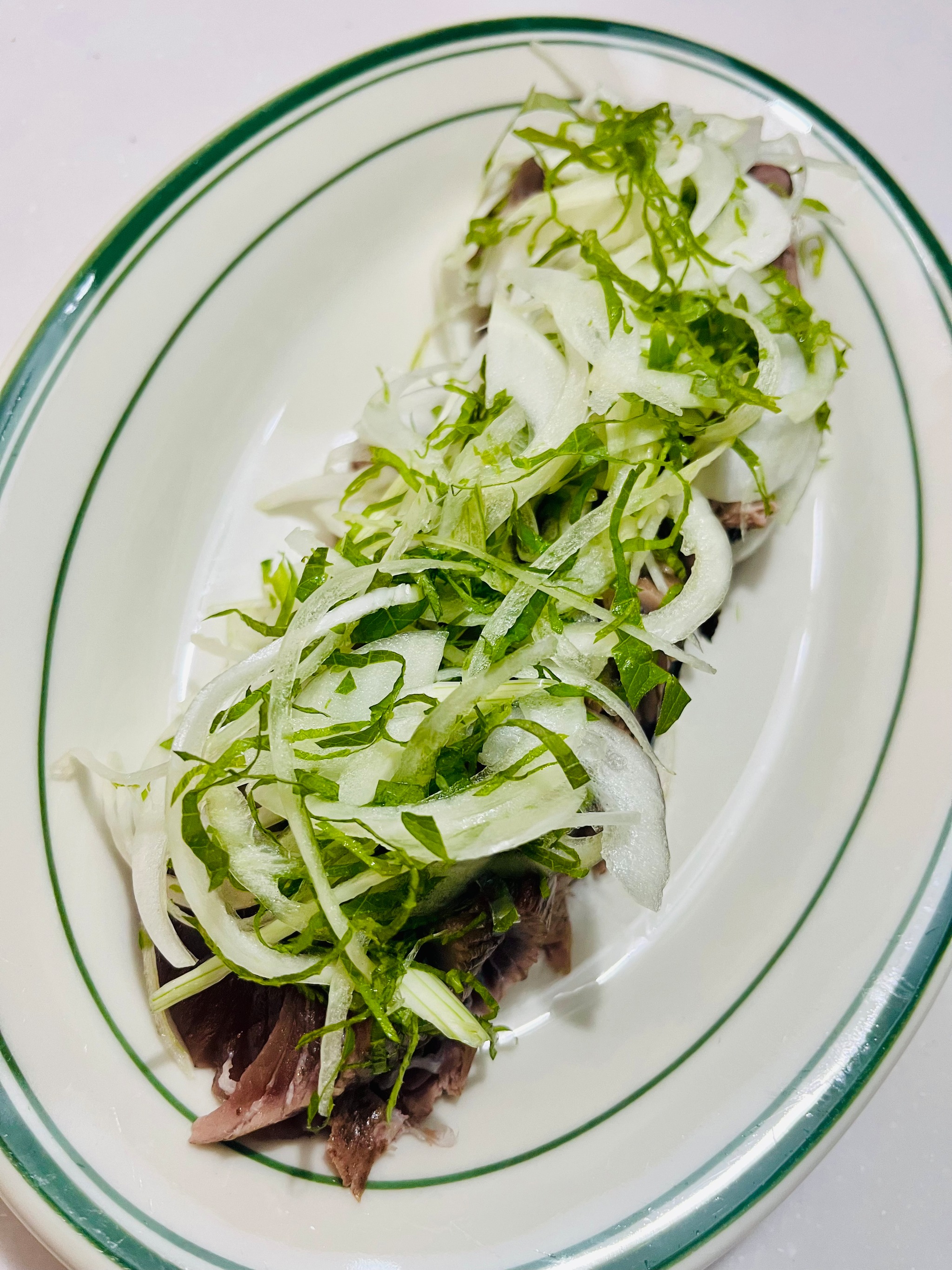 生のスライスと大葉を鰹たたきにのっけ盛り😋