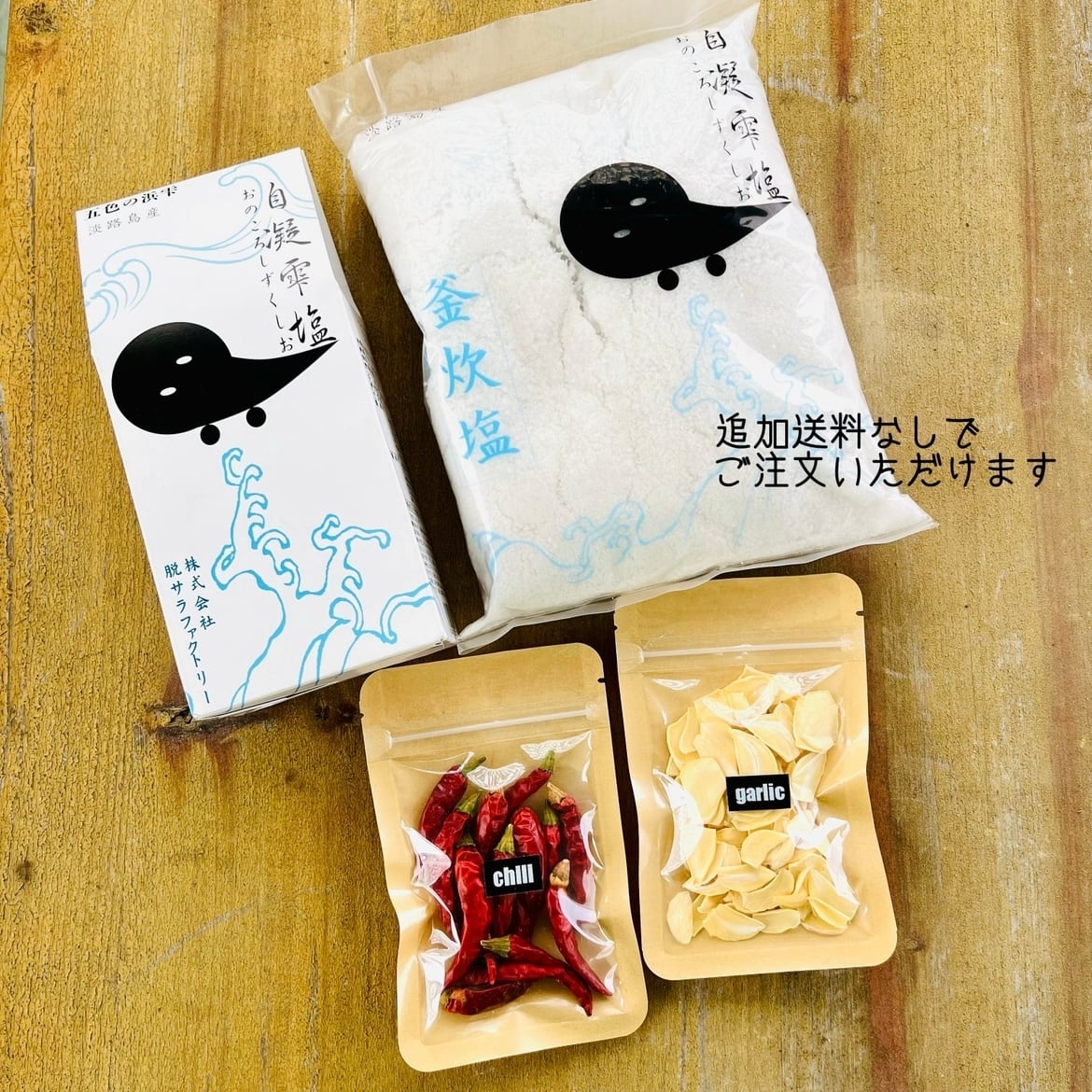 ✴︎追加送料なしで無農薬で育てた乾燥ガーリック、鷹の爪、淡路島のお塩“自凝雫塩”をご注文いただけます