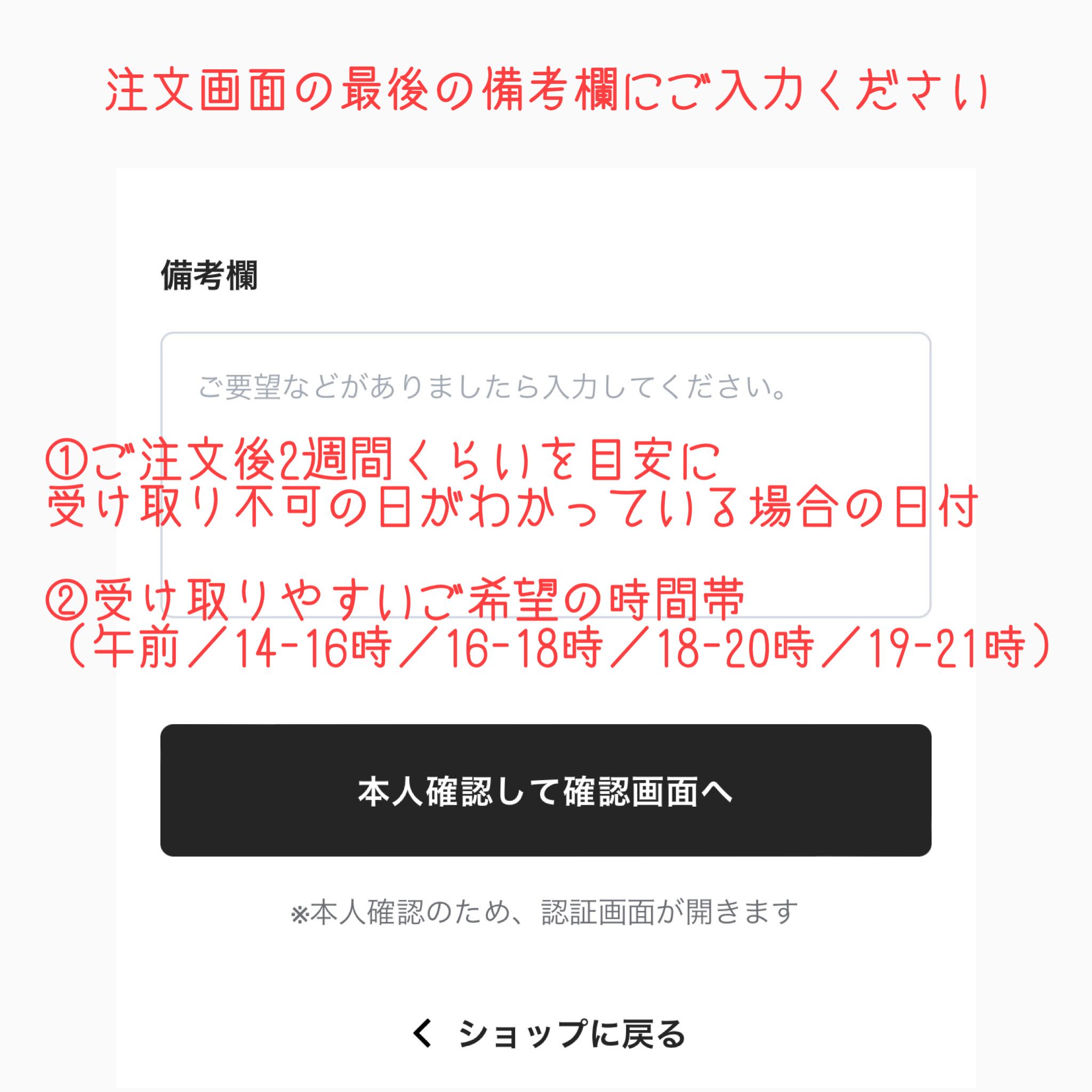 ①ご注文から2週間を目安に、受け取れない日がお分かりの場合その日をお知らせください